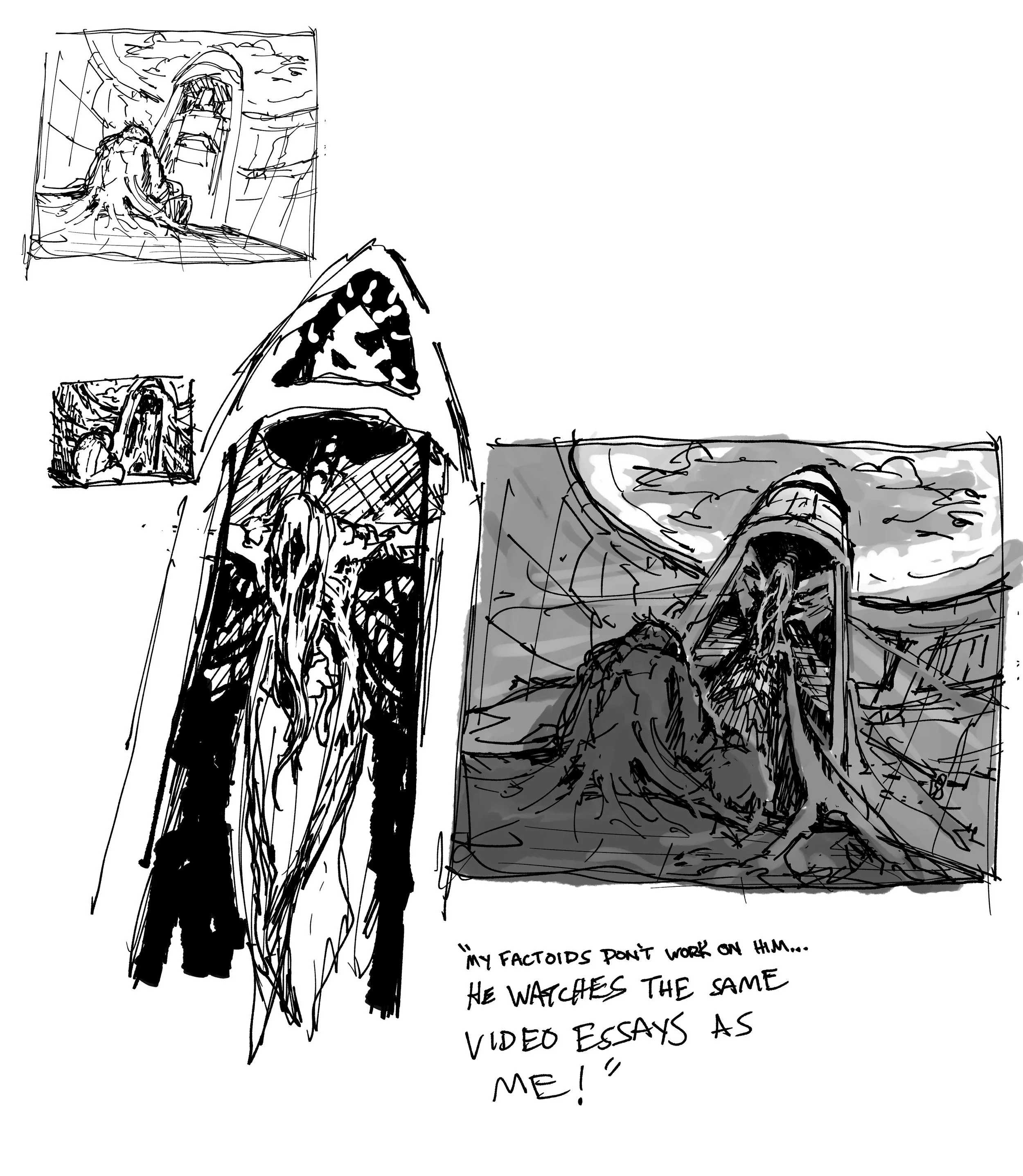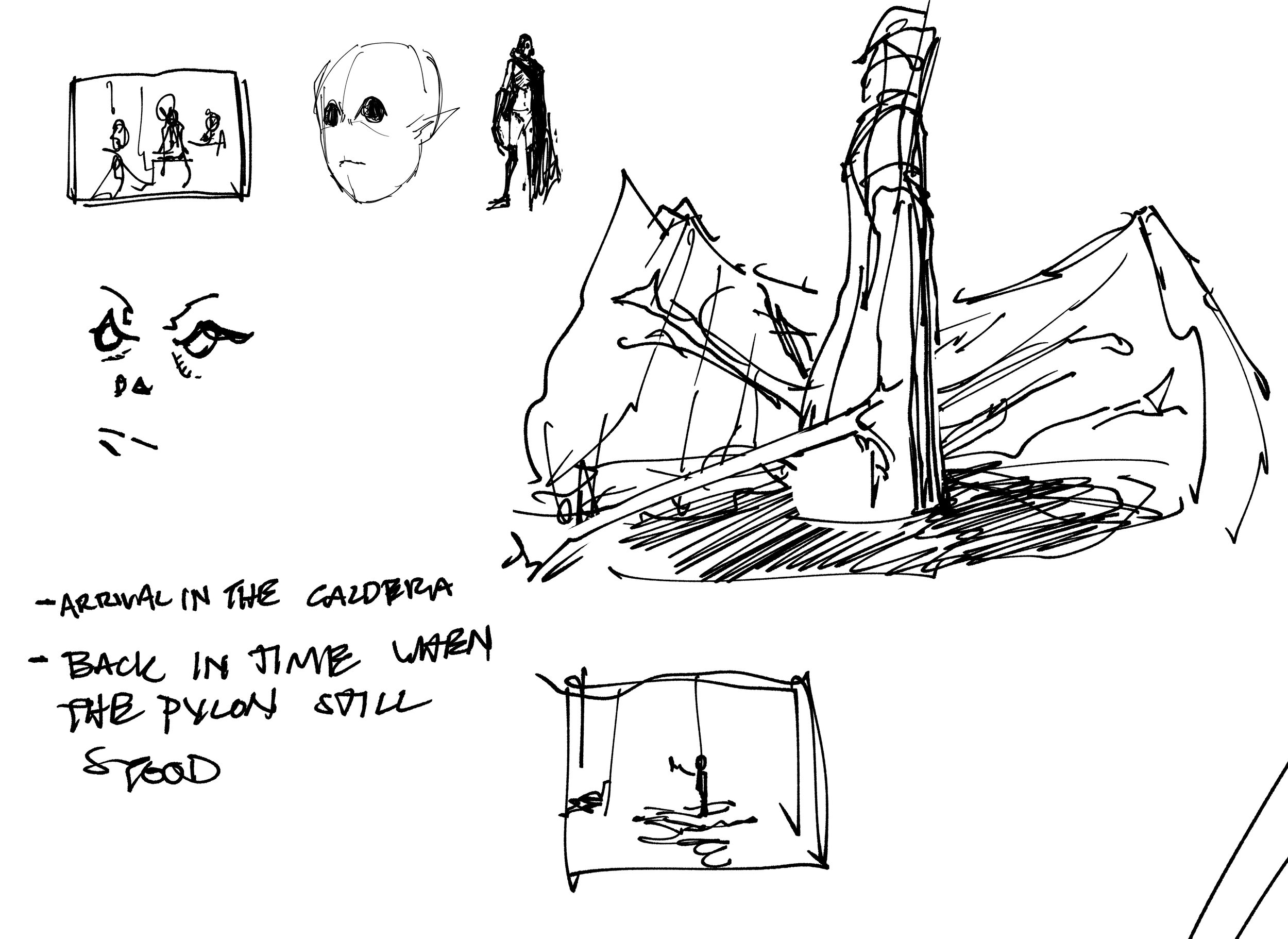 I decided to focus more into how I might depict the location if I had to tell a story within the same image. The pylon at the center works as a religious object in the story, the idea of gods that lived alongside men was in my mind.